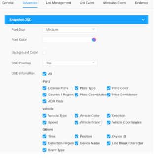 Gunder Punktet ”Advanced” kan flere indstillinger laves, til at konfigurere de infoer der gemmes sammen med billederne af nummerpladerne. Se eksempel her: