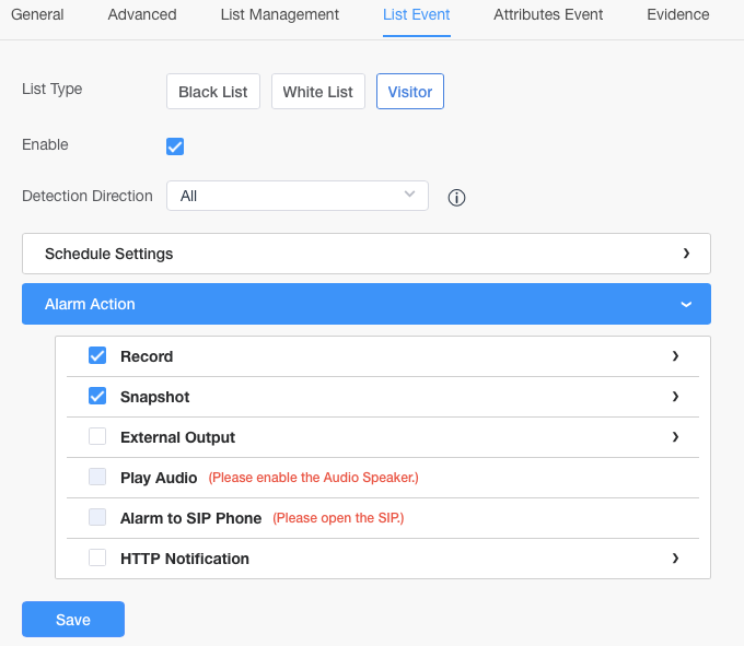 Under ”Alarm Actions” kan der vælges den action, der skal ske, når en bil kommer in sight.